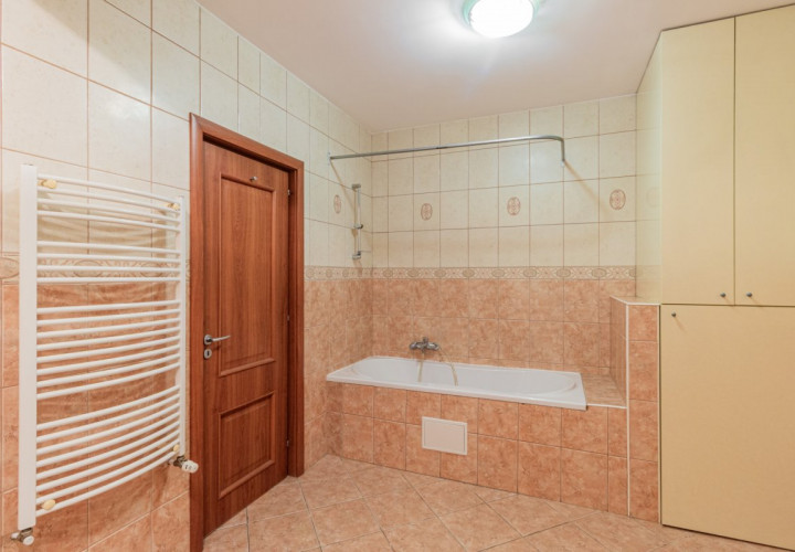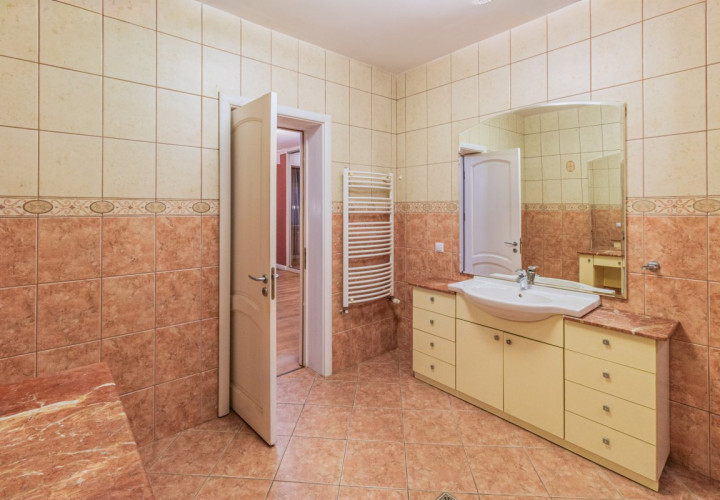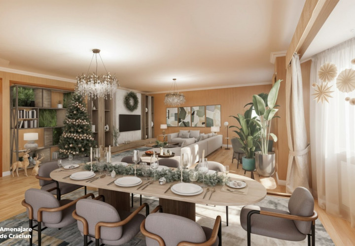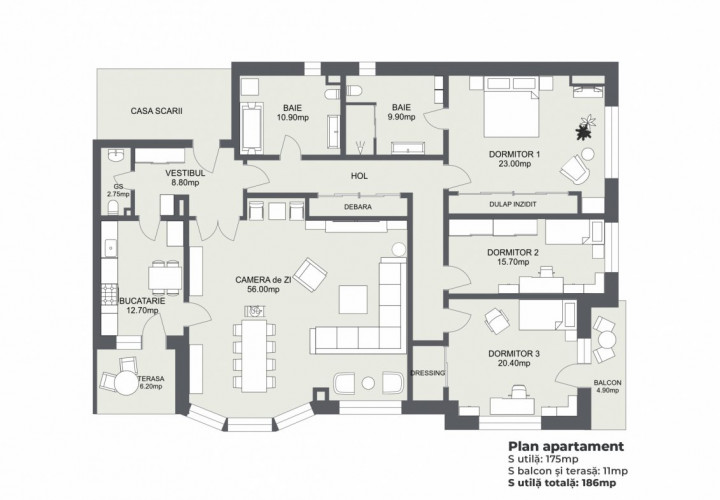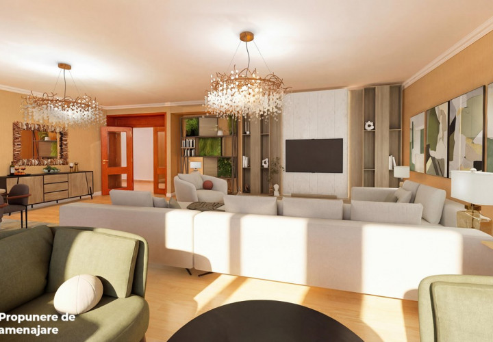 Apartamentul are o suprafata utila de 175mp, decomandat, la care se adauga o terasa si un balcon a caror suprafete insumeaza 11mp. Din holul larg, cu spatiu suficient pentru depozitarea hainelor, patrunzi intr-o senzationala camera de zi: 56mp! Cum ar fi ca de Craciun sa poti pune masa pentru doisprezece persoane, copiii sa se bucure in jurul bradului, si tot sa ramana loc si pentru dans?