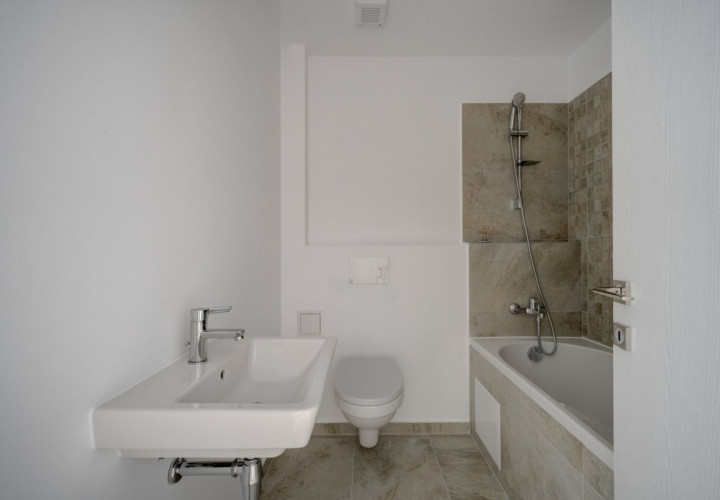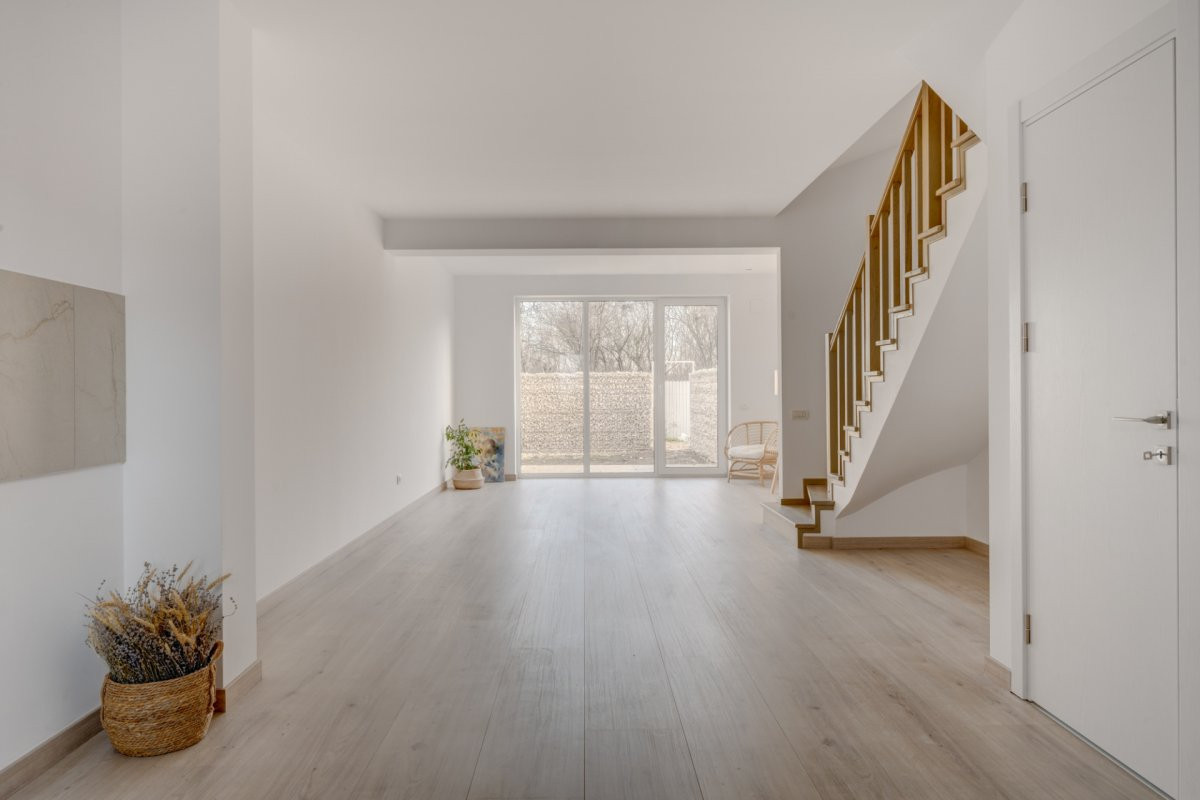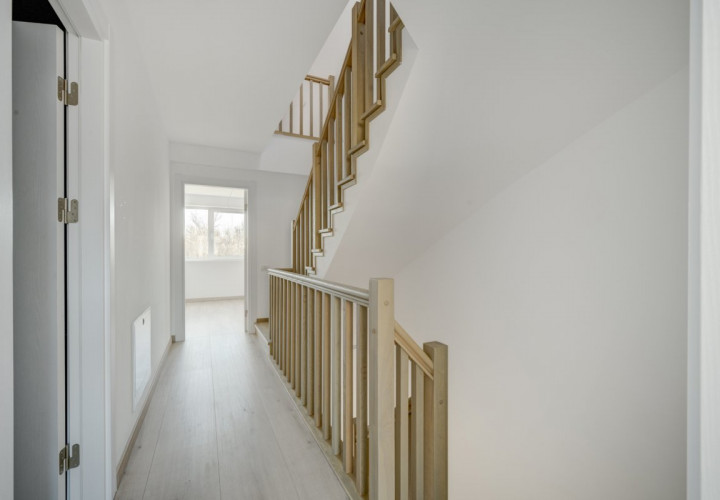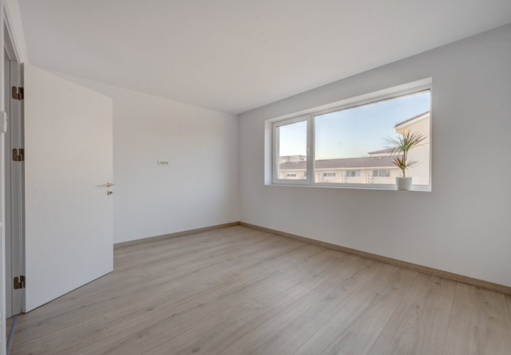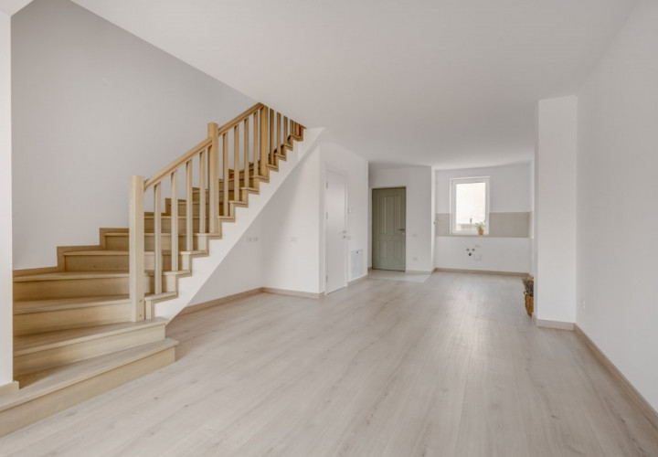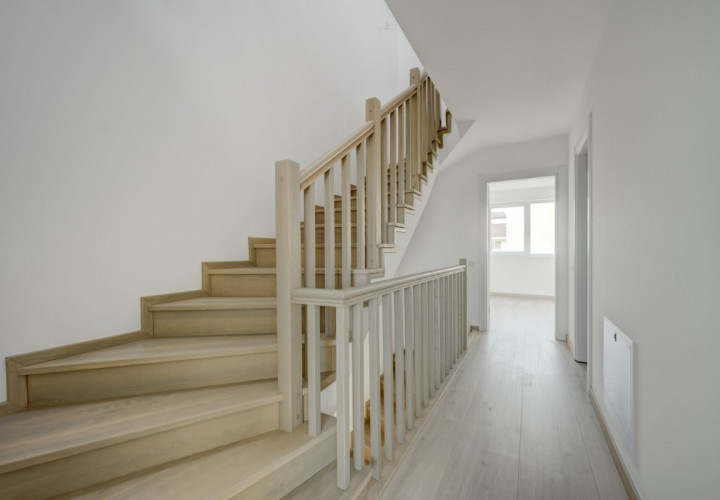 Parchetul de calitate, ușile albe, scara placată cu lemn, amenajarea băilor cu plăci ceramice de culori neutre, montate cu atenție, formează un tot unitar.