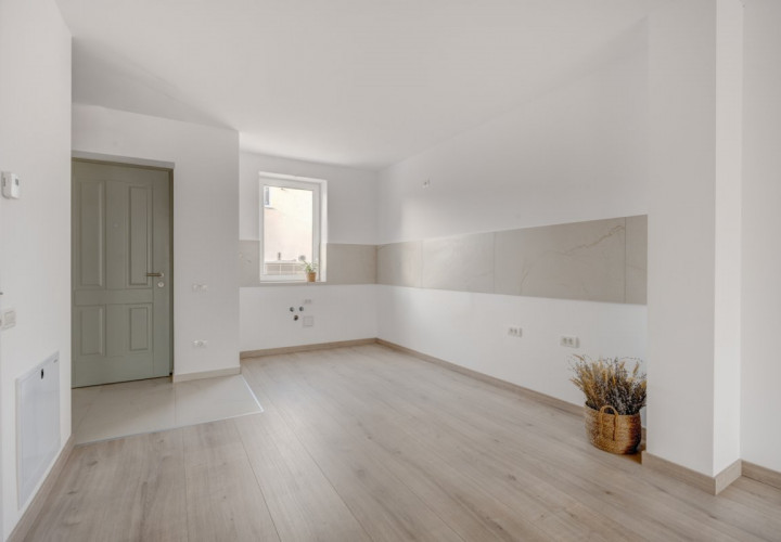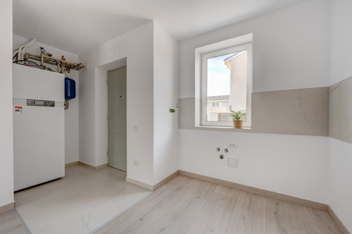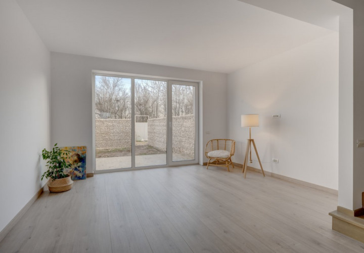 Parterul casei este format dintr-o cameră de zi cu ieșire spre curte, bucătăria deschisă și o baie de serviciu. Bucătăria poate fi închisă, având fereastră proprie și suficient spațiu.