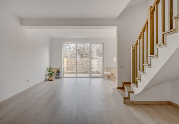 În orașul Voluntari, pe strada Școlii, în complexul imobiliar Avangarde Forest, sunt disponibile la vânzare două case alăturate dispuse pe P+1+M. Cele două case fac parte dintr-un grup de patru case înșiruite, ele fiind cele din mijloc. În fața casei se pot parca două mașini, iar în spate este o mică curte cu ieșire spre un drum din spatele complexului.